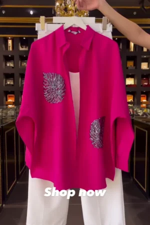 Vibrant Magenta Embellished Oversized Shirt & Pristine White Tailored Wide-Leg Trouser Set with Chain-Detail Belt