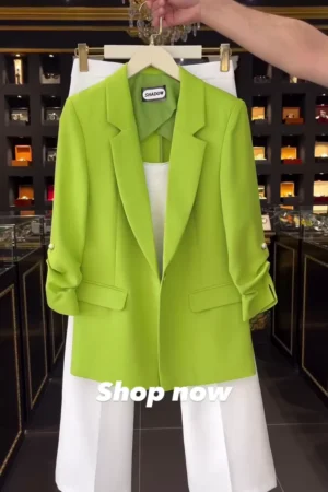 Elegant Two-Piece Women’s Formal Suit Set – Vibrant Lime Green Ruched Sleeve Blazer & High-Waisted White Flare Leg Trousers – Premium Office Wear & Occasion Outfit