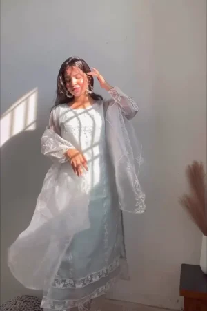 Ethereal Powder Blue Floral Embroidered Straight Kurta Set with Sheer Organza Dupatta and Lace Detailed Trousers