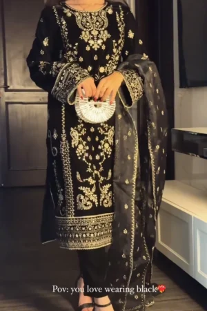 Royal Black Velvet Straight Kurta Set with Intricate Golden Zari Embroidery, Statement Sleeves, and Shimmering Organza Dupatta