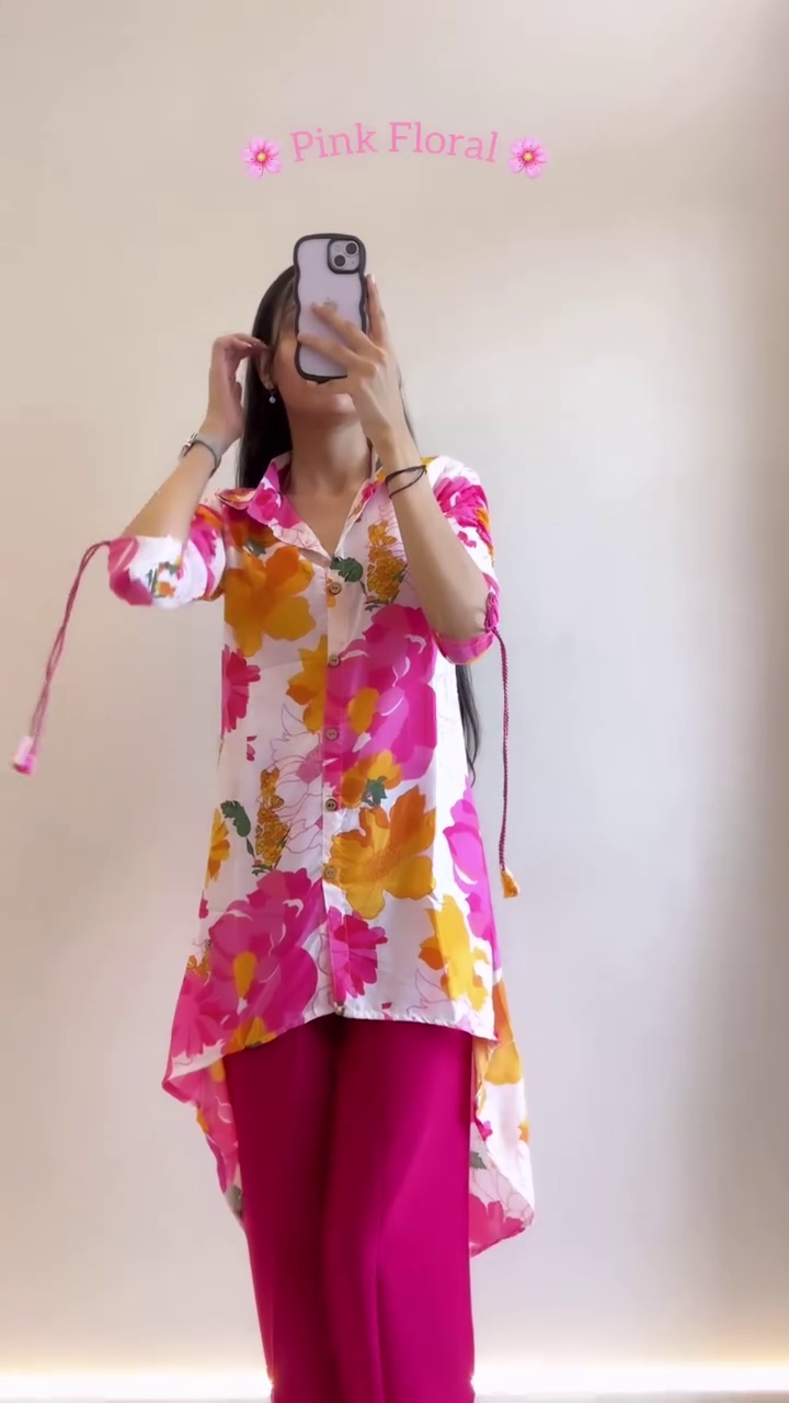 High-Low Shirt Style Kurti with Pink Bottoms ? Features a modern high-low hemline with a shirt-inspired design, paired with comfortable pink pants that add a vibrant touch, perfect for casual and festive occasions.