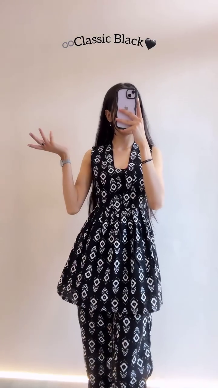 Classic Black Sleeveless Ikat Peplum Kurti ? Designed with a flattering peplum silhouette and traditional Ikat print, paired with matching pants for a sophisticated and chic ethnic look.