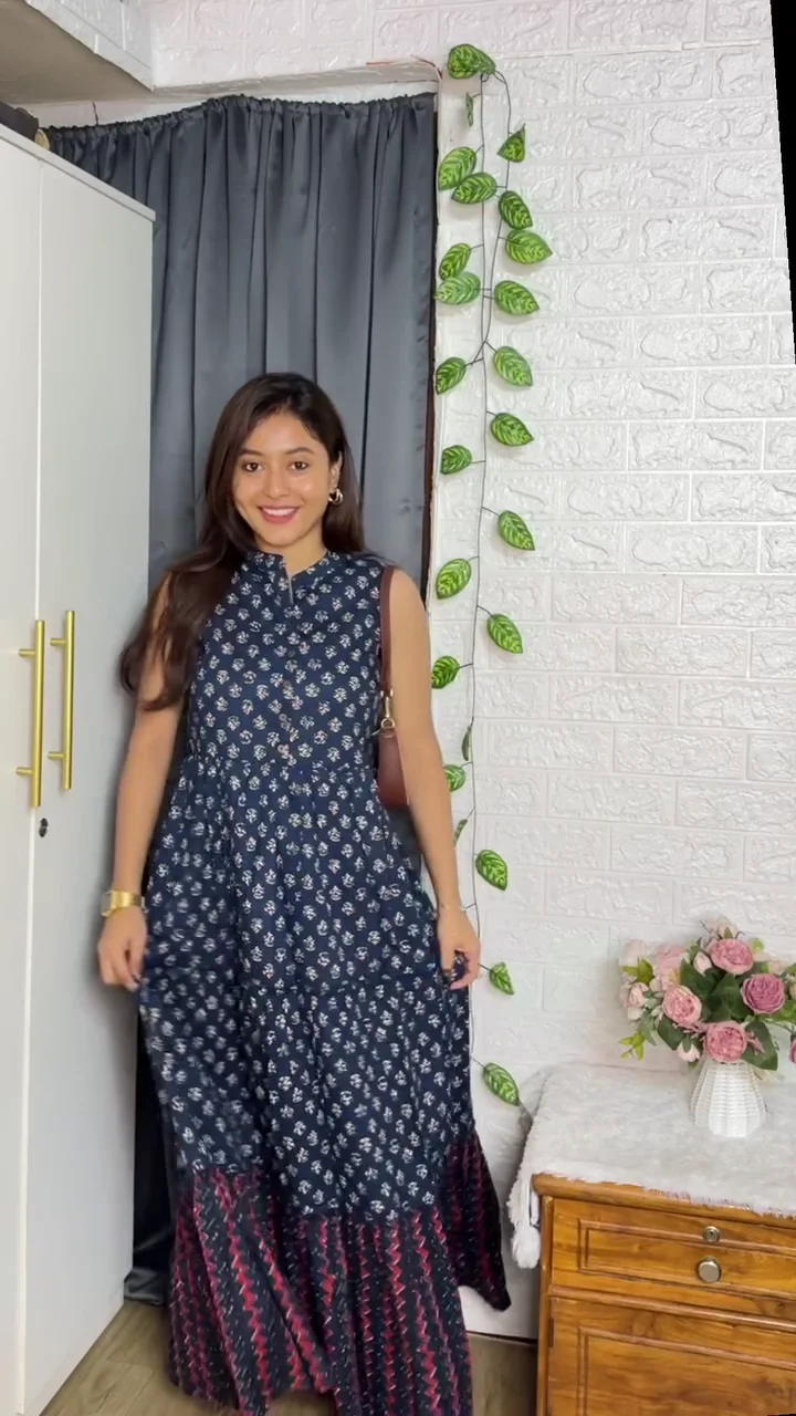 Printed Flared Design: The navy blue sleeveless printed maxi gives a breezy, feminine vibe, perfect for daytime wear, casual outings, or festive gatherings.